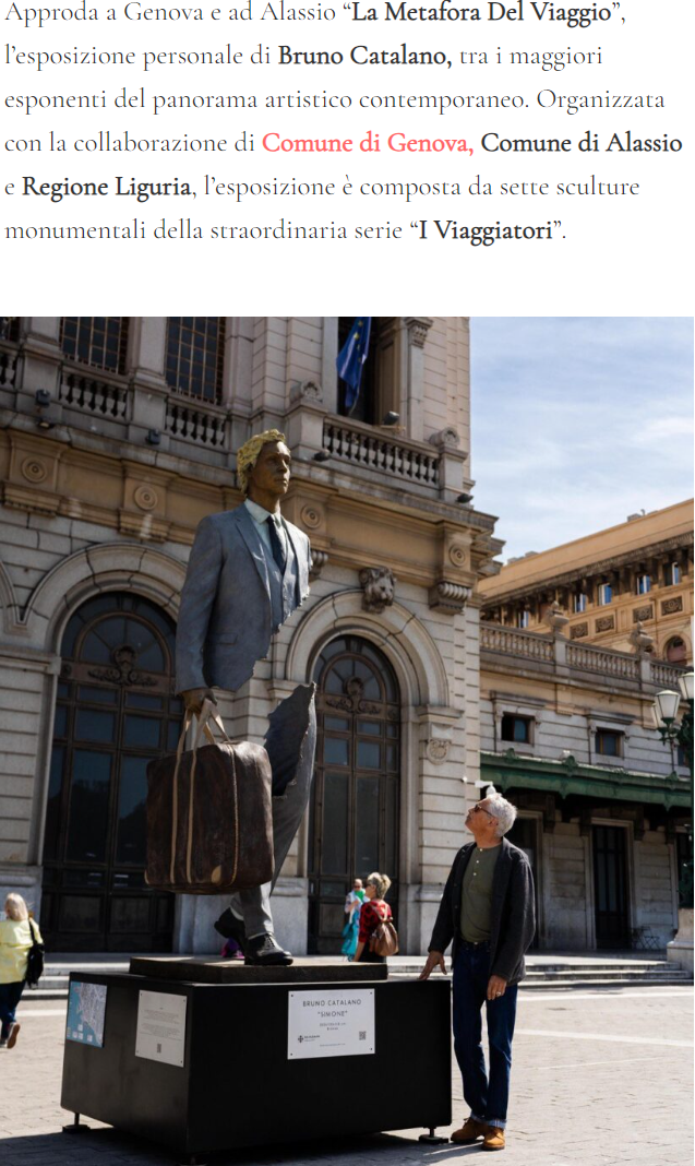 Approda a Genova e ad Alassio “La Metafora Del Viaggio”, l’esposizione personale di Bruno Catalano, tra i maggiori esponenti del panorama artistico contemporaneo. Organizzata con la collaborazione di Comune di Genova, Comune di Alassio e Regione Liguria, l’esposizione è composta da sette sculture monumentali della straordinaria serie “I Viaggiatori”.